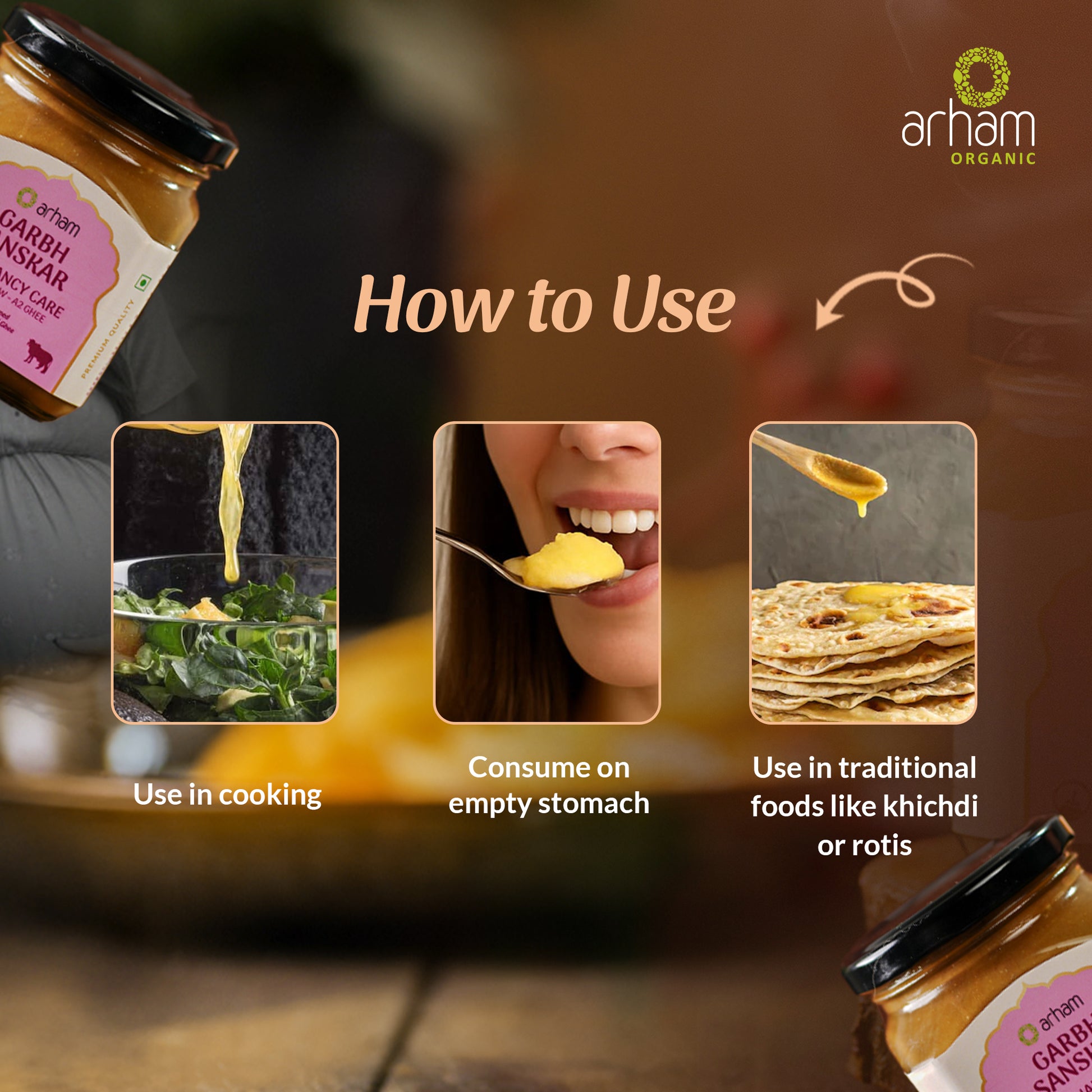 Experience the benefits of ancient Ayurvedic wisdom with Arham Organic Garbh Sanskar Ghee, a specialized formulation for prenatal nourishment. Crafted from Bilona-churned A2 Gir Cow Ghee and infused with Vidarikand (Pueraria Tuberosa), this ghee supports a healthy pregnancy, fosters baby’s development, and strengthens maternal vitality throughout the gestation period.